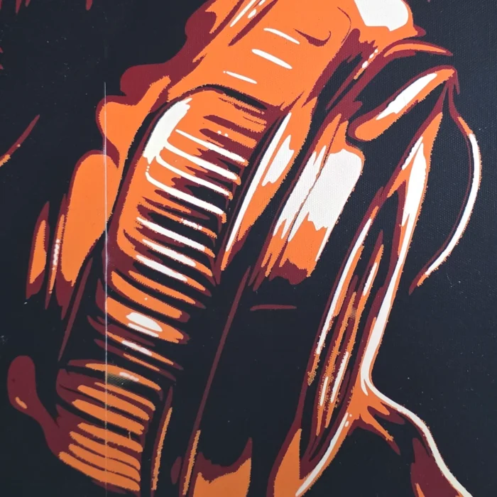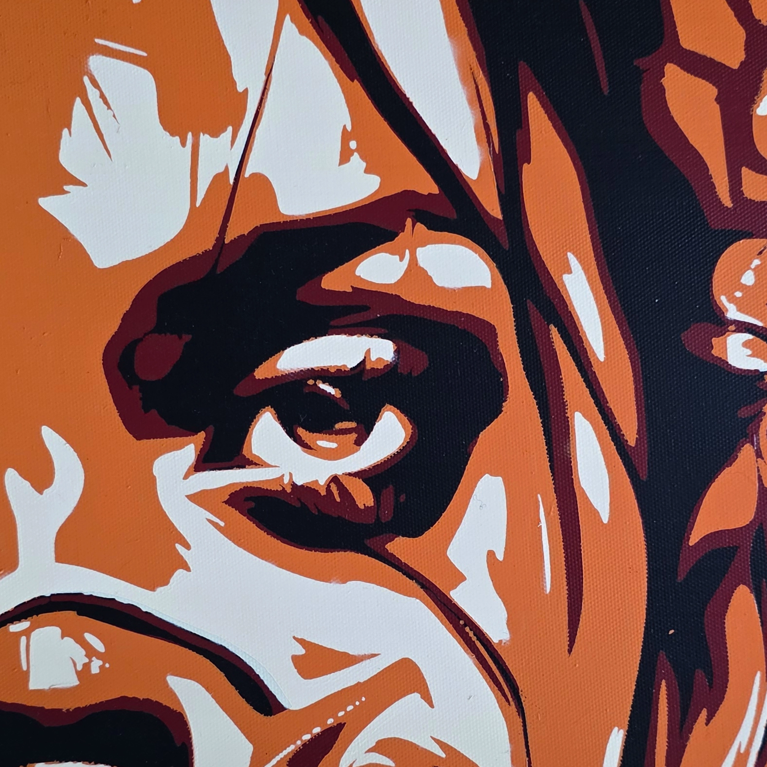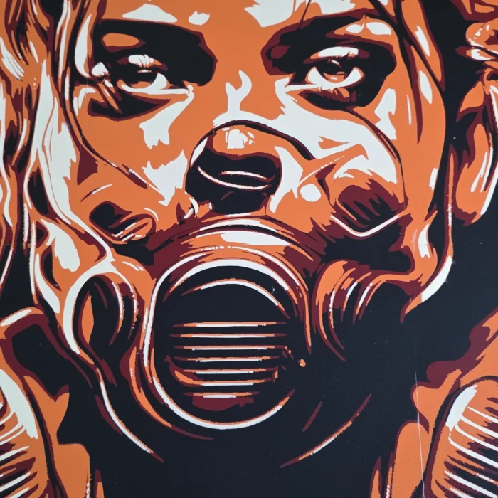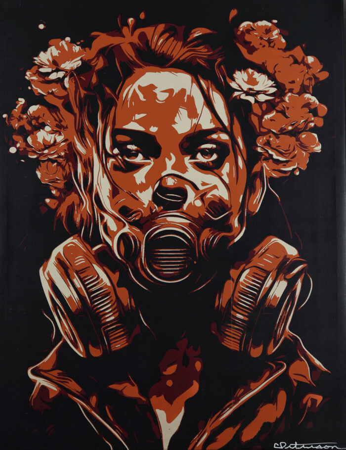 Beauty forged with poison and survival — flowers blooming through a mask. Spray + acrylic on canvas.