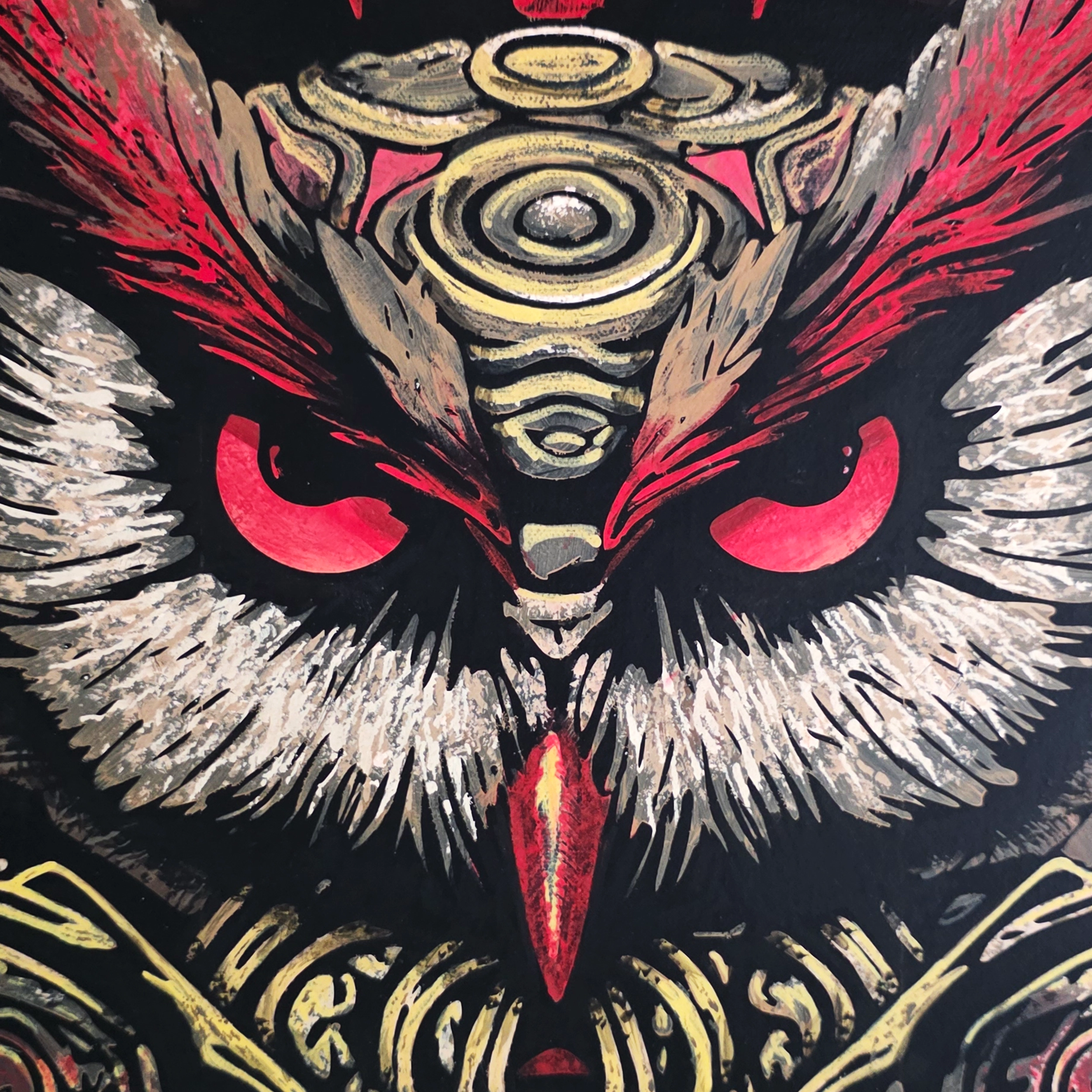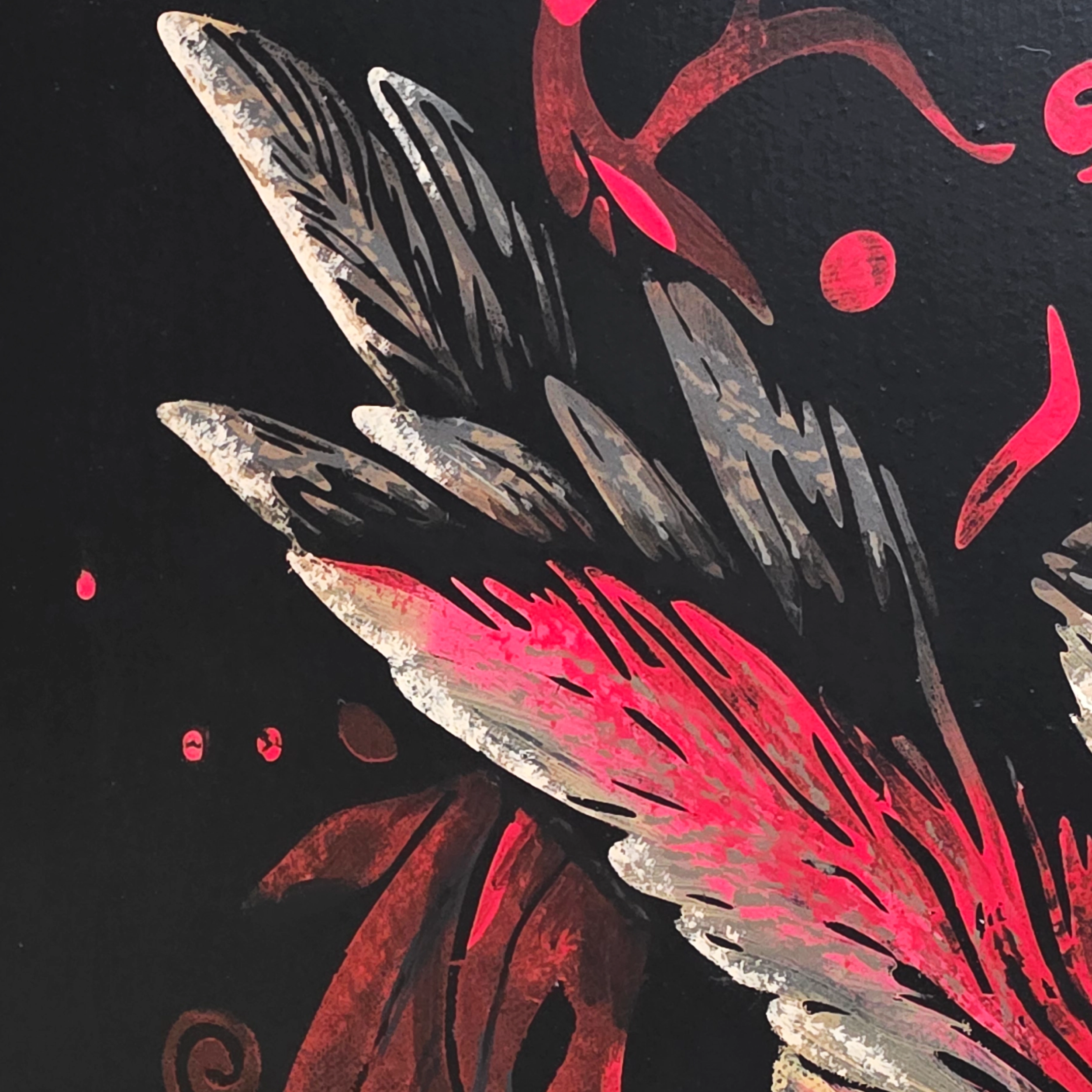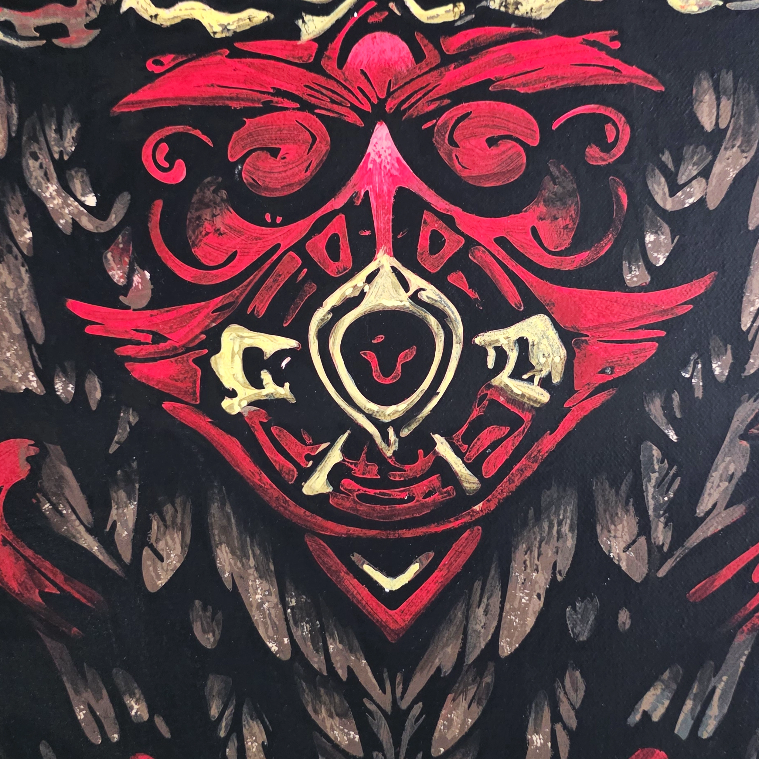 A warlord spirit — feathers forged into sigils and armor. Spray + acrylic on canvas.