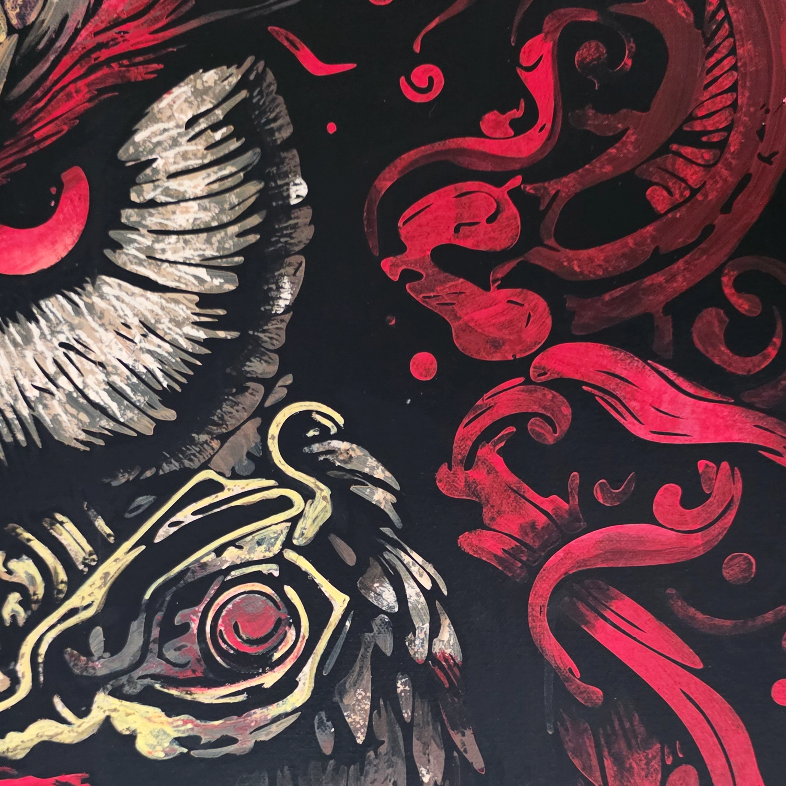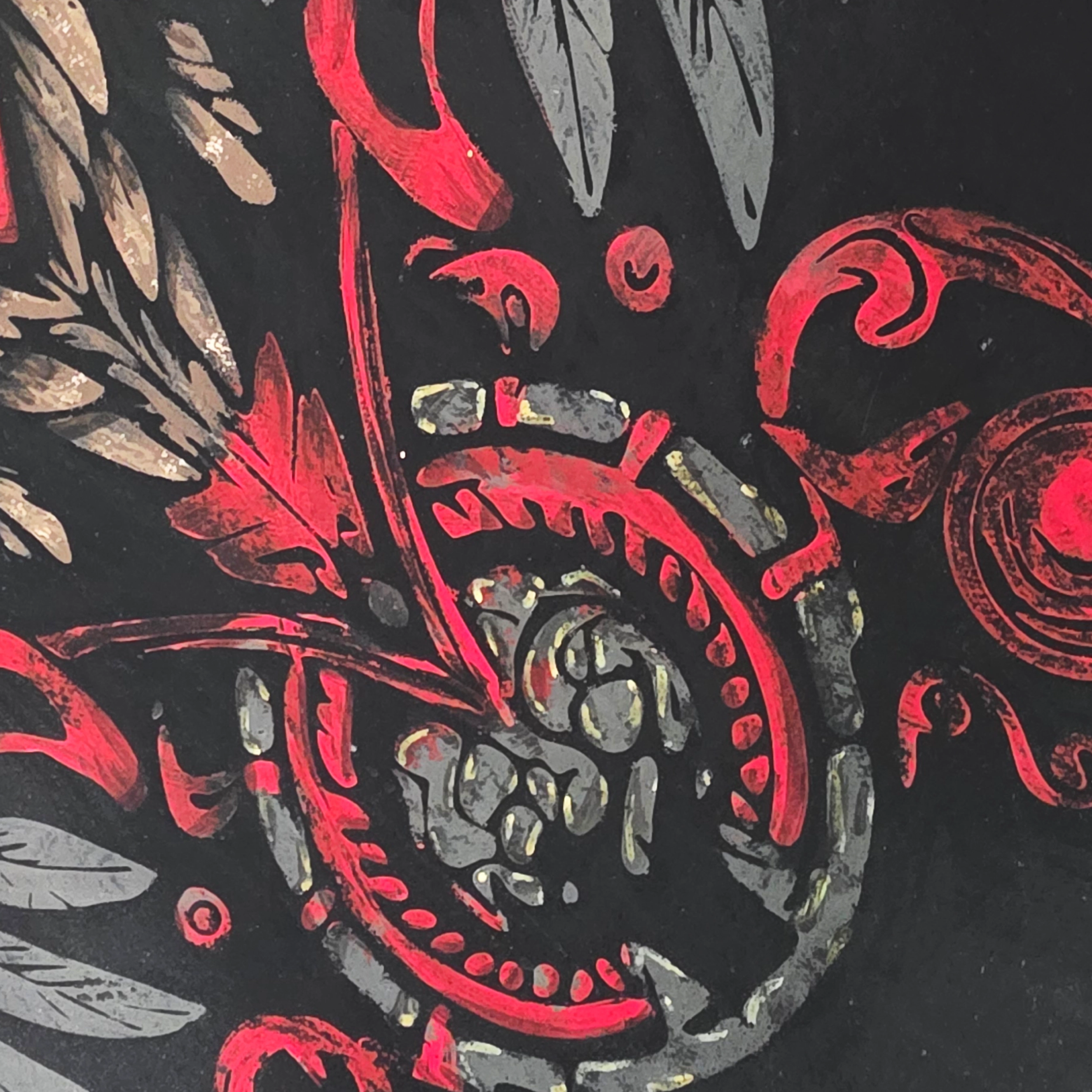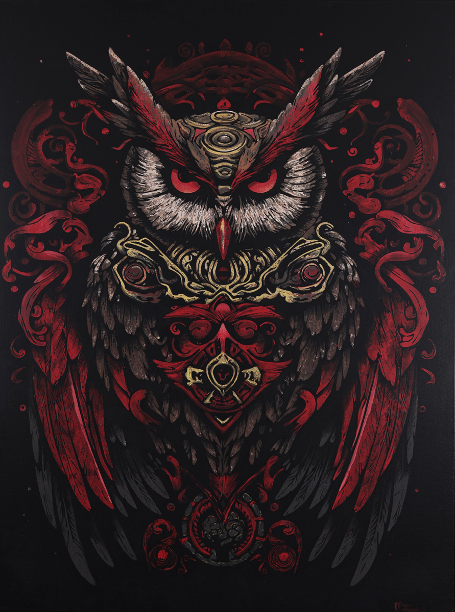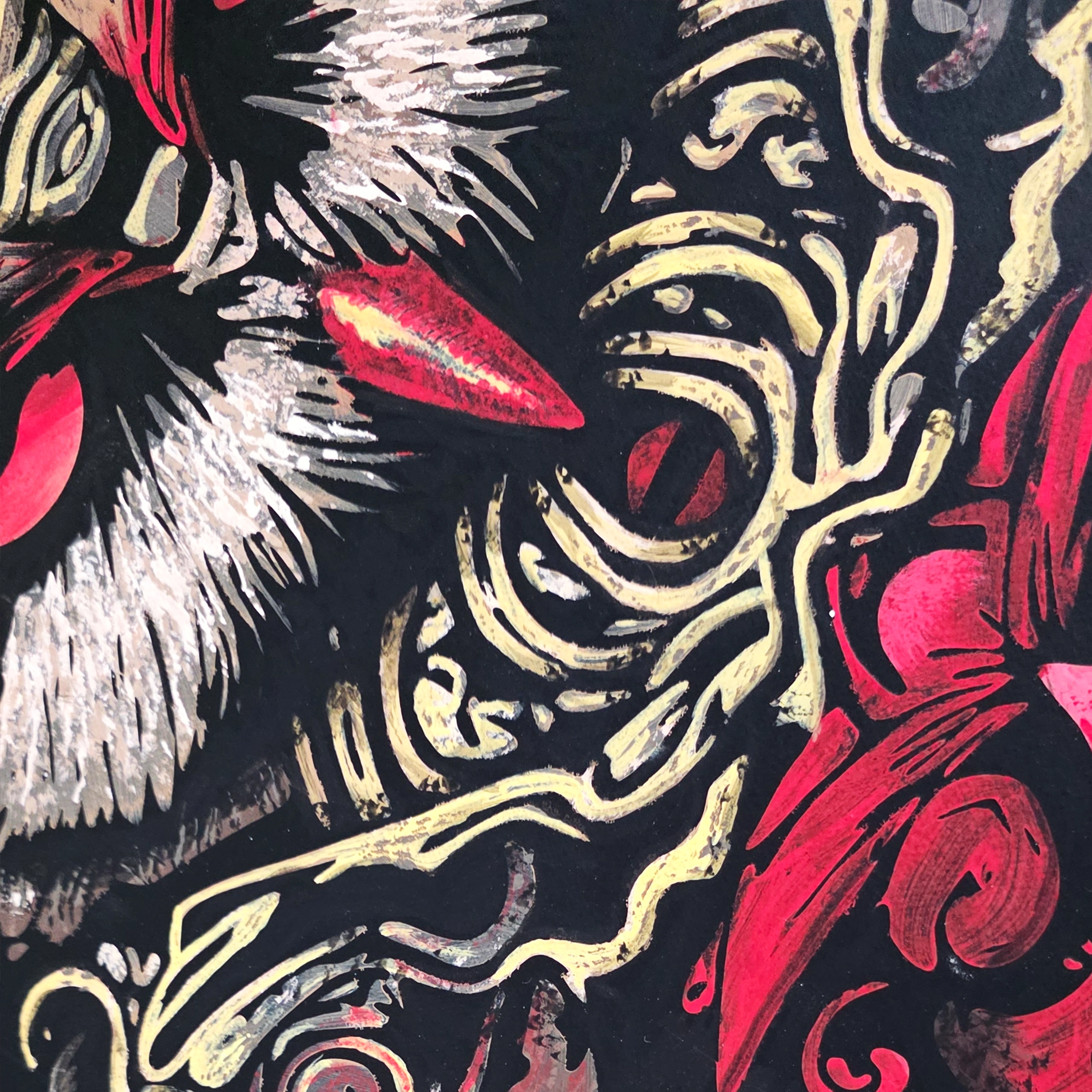 A warlord spirit — feathers forged into sigils and armor. Spray + acrylic on canvas.